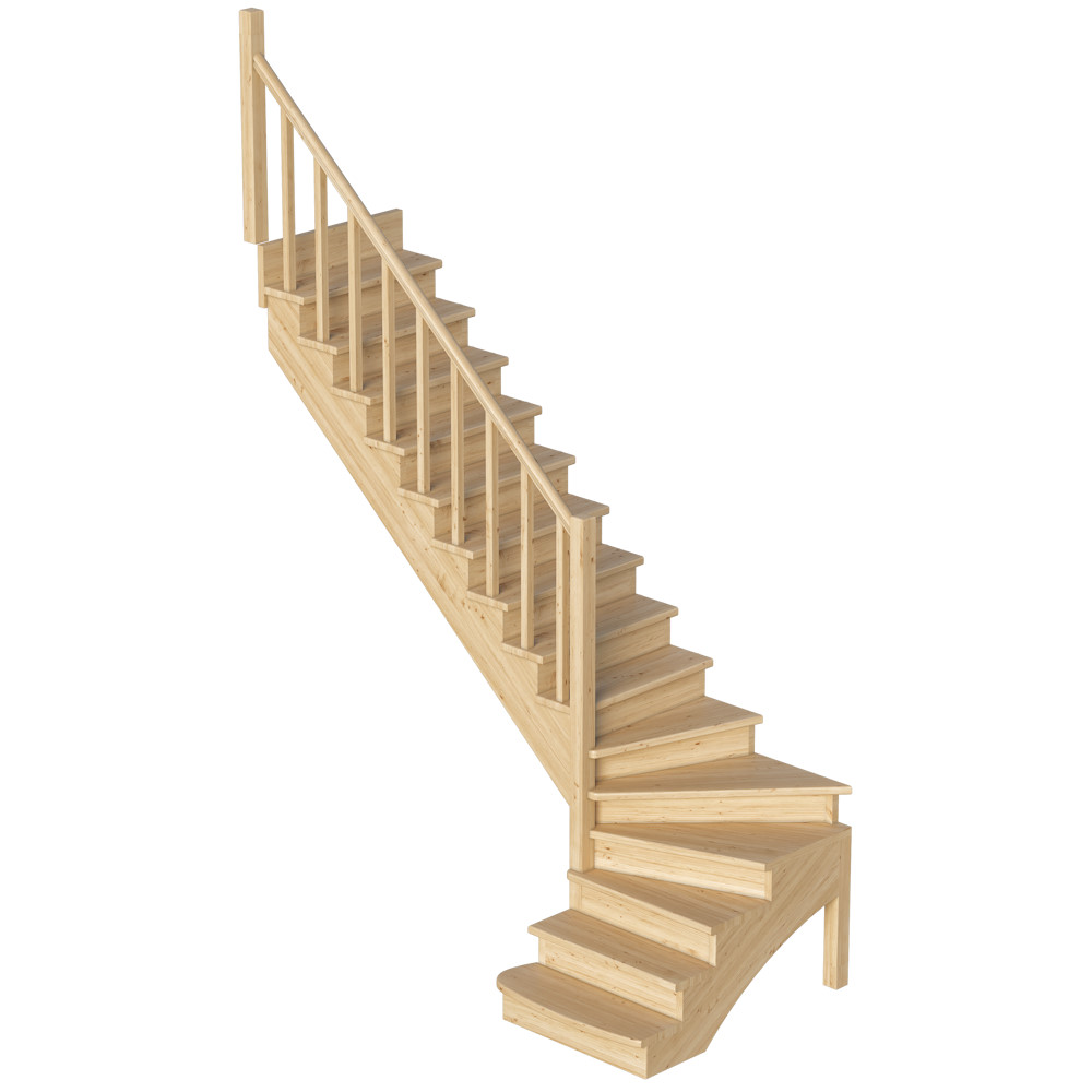 Удобная и современная модель с забежными ступенями будет отличным решением для помещений, где необходимо сэкономить свободное пространство. Сдержанный классический дизайн великолепно впишется в интерьер любого стиля и создаст уютную домашнюю атмосферу. Лестница имеет поворот на 90? и выпускается в 8 различных вариантах, что существенно упрощает ее подбор.