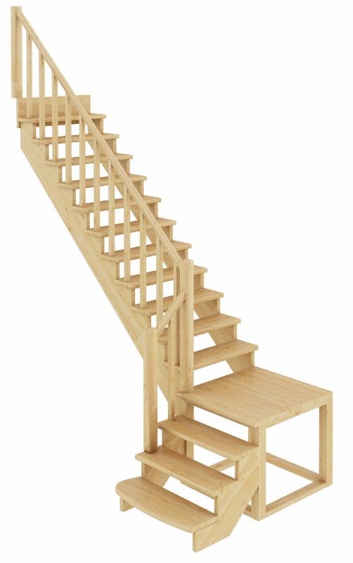 Функциональная модель сконструирована по классическому принципу марш-промежуточная площадка-марш, за счет чего отличается повышенной комфортностью и удобством эксплуатации. Традиционный дизайн эстетично впишется в интерьер дома и будет его достойным украшением. Лестница имеет поворот на 90? и выпускается в 4 различных вариантах, что существенно упрощает ее подбор. Для изготовления лестницы под покраску используется сосна с небольшими изменениями цвета - синевой, такой допустимый порок древесины существенно не влияет на ее механические свойства и практически незаметен при покраске в тёмные цвета.