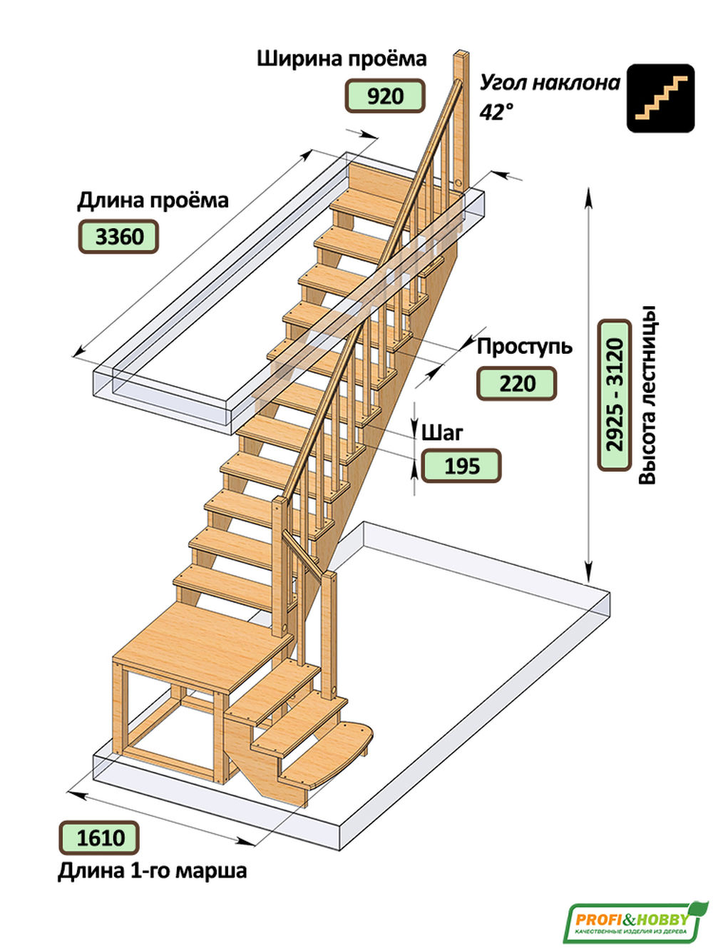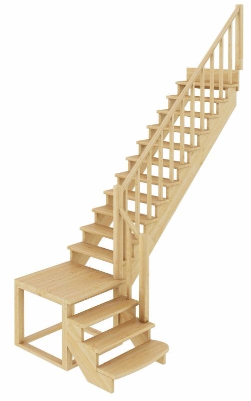 Функциональная модель сконструирована по классическому принципу марш-промежуточная площадка-марш, за счет чего отличается повышенной комфортностью и удобством эксплуатации. Традиционный дизайн эстетично впишется в интерьер дома и будет его достойным украшением. Лестница имеет поворот на 90? и выпускается в 4 различных вариантах, что существенно упрощает ее подбор. Для изготовления лестницы под покраску используется сосна с небольшими изменениями цвета - синевой, такой допустимый порок древесины существенно не влияет на ее механические свойства и практически незаметен при покраске в тёмные цвета.