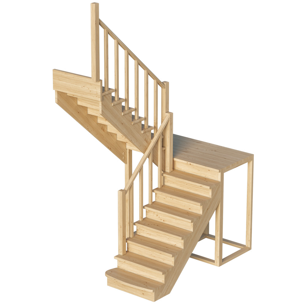 Удобная модель выполнена по традиционной схеме марш-промежуточная площадка-марш, за счет чего отличается повышенной комфортностью. Предложенный дизайн в сочетании с универсальной конструкцией придется по вкусу всем почитателям классики. Лестница имеет поворот на 180 градусов и выпускается в 4 различных вариантах, что существенно упрощает ее подбор. В комплекте прилагается вся необходимая для сборки фурнитура. Для изготовления лестницы под покраску используется сосна с небольшими изменениями цвета - синевой, такой допустимый порок древесины существенно не влияет на ее механические свойства и практически незаметен при покраске в тёмные цвета.