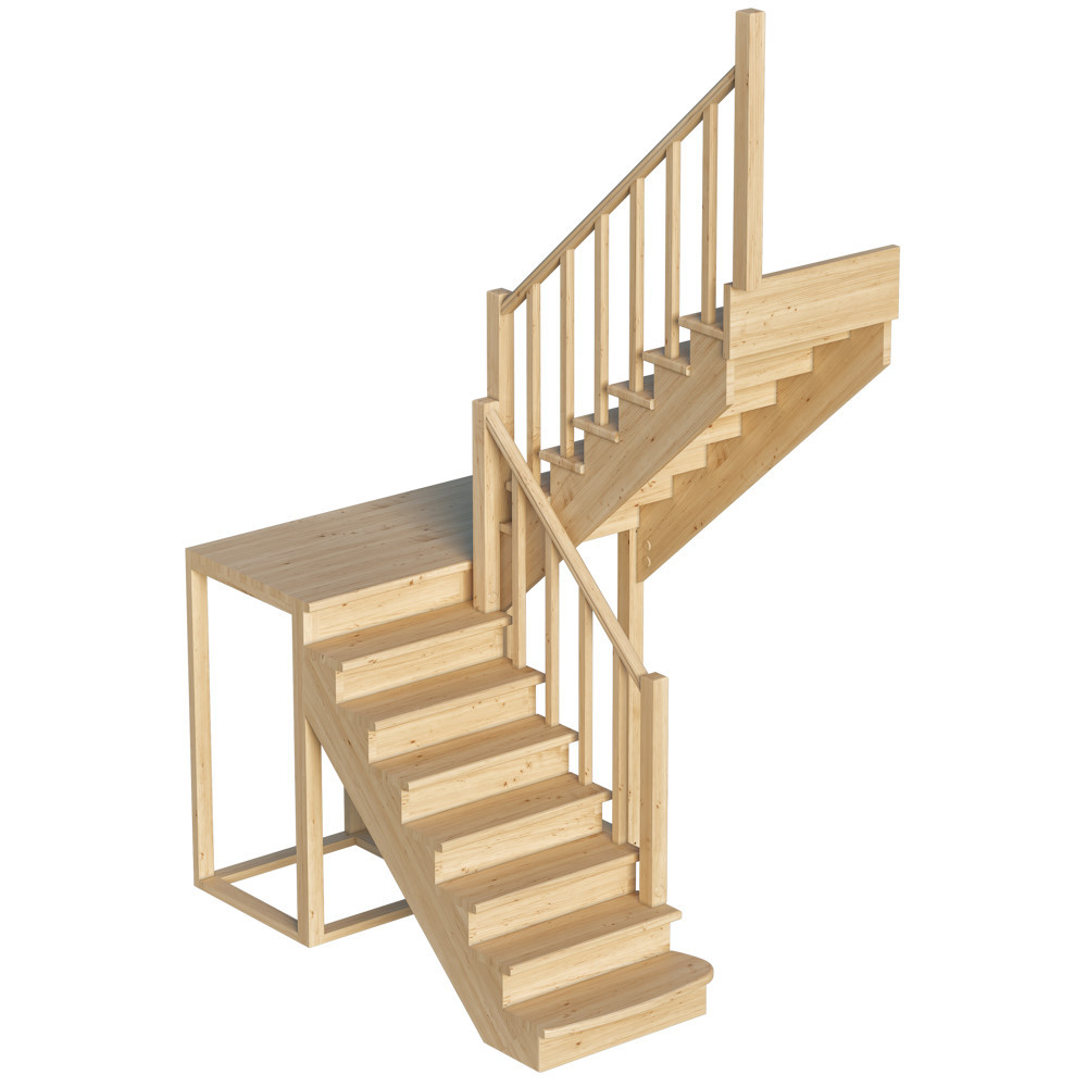 Удобная модель выполнена по традиционной схеме марш-промежуточная площадка-марш, за счет чего отличается повышенной комфортностью. Предложенный дизайн в сочетании с универсальной конструкцией придется по вкусу всем почитателям классики. Лестница имеет поворот на 180 градусов и выпускается в 4 различных вариантах, что существенно упрощает ее подбор. В комплекте прилагается вся необходимая для сборки фурнитура. Для изготовления лестницы под покраску используется сосна с небольшими изменениями цвета - синевой, такой допустимый порок древесины существенно не влияет на ее механические свойства и практически незаметен при покраске в тёмные цвета.