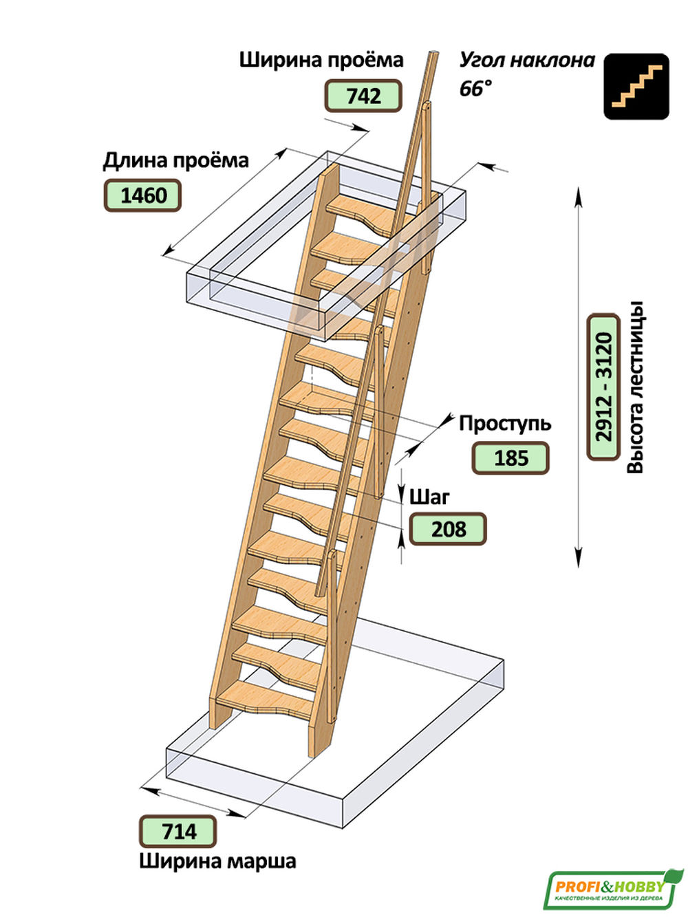 Универсальная малогабаритная модель чердачного типа отличается прочностью конструкции за счет увеличения толщины ступеней и тетивы до 40 мм. Лестница многофункциональна, надежна в использовании и подойдет для любых помещений, в том числе и вспомогательных. Установка легко производится как в углу помещения, так и между стенами.