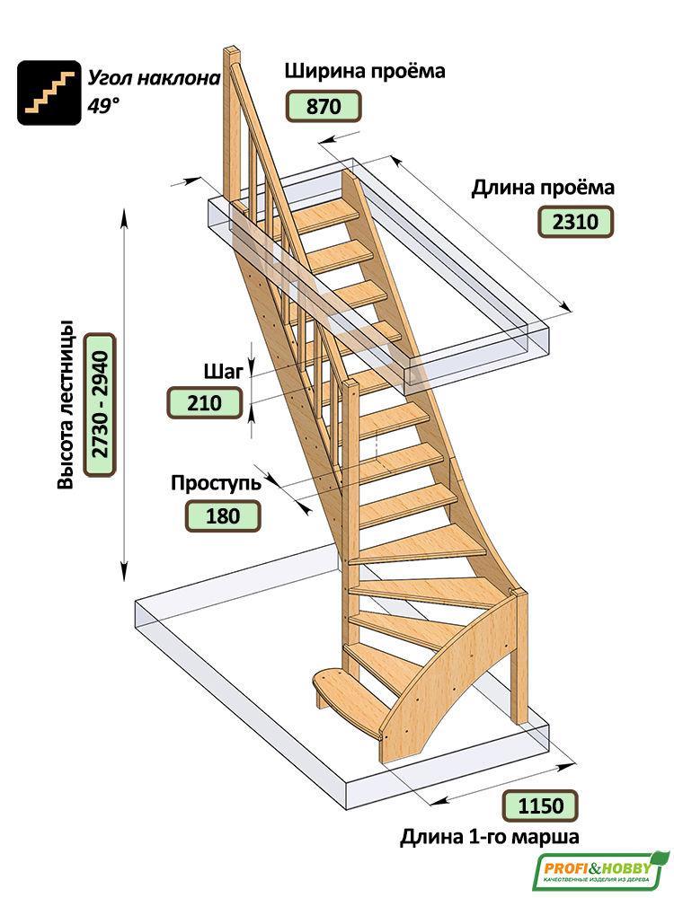 Удобная компактная модель оснащена забежными ступенями, за счет чего легко монтируется на ограниченном пространстве. Изготовлена на тетивах и имеет врезные ступени. Строго соответствует всем современным требованиям комфорта и безопасности. Лестница имеет поворот на 90 градусов. Для изготовления лестницы под покраску используется сосна с небольшими изменениями цвета - синевой, такой допустимый порок древесины существенно не влияет на ее механические свойства и практически незаметен при покраске в тёмные цвета.