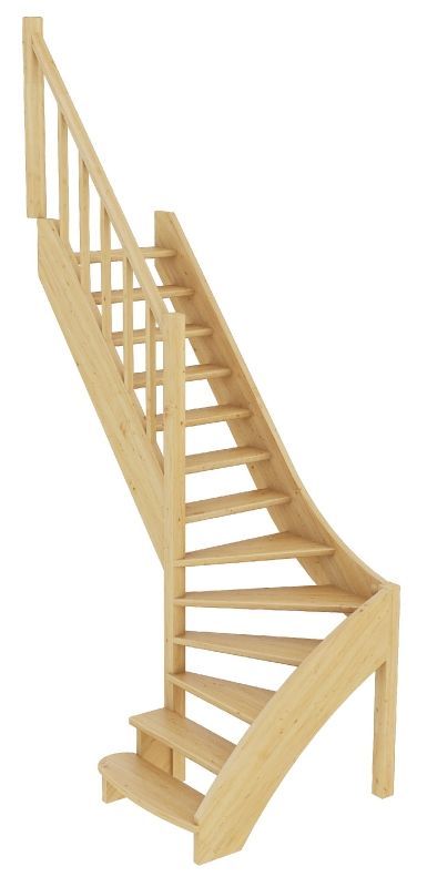 Удобная компактная модель оснащена забежными ступенями, за счет чего легко монтируется на ограниченном пространстве. Изготовлена на тетивах и имеет врезные ступени. Строго соответствует всем современным требованиям комфорта и безопасности. Лестница имеет поворот на 90 градусов. Для изготовления лестницы под покраску используется сосна с небольшими изменениями цвета - синевой, такой допустимый порок древесины существенно не влияет на ее механические свойства и практически незаметен при покраске в тёмные цвета.