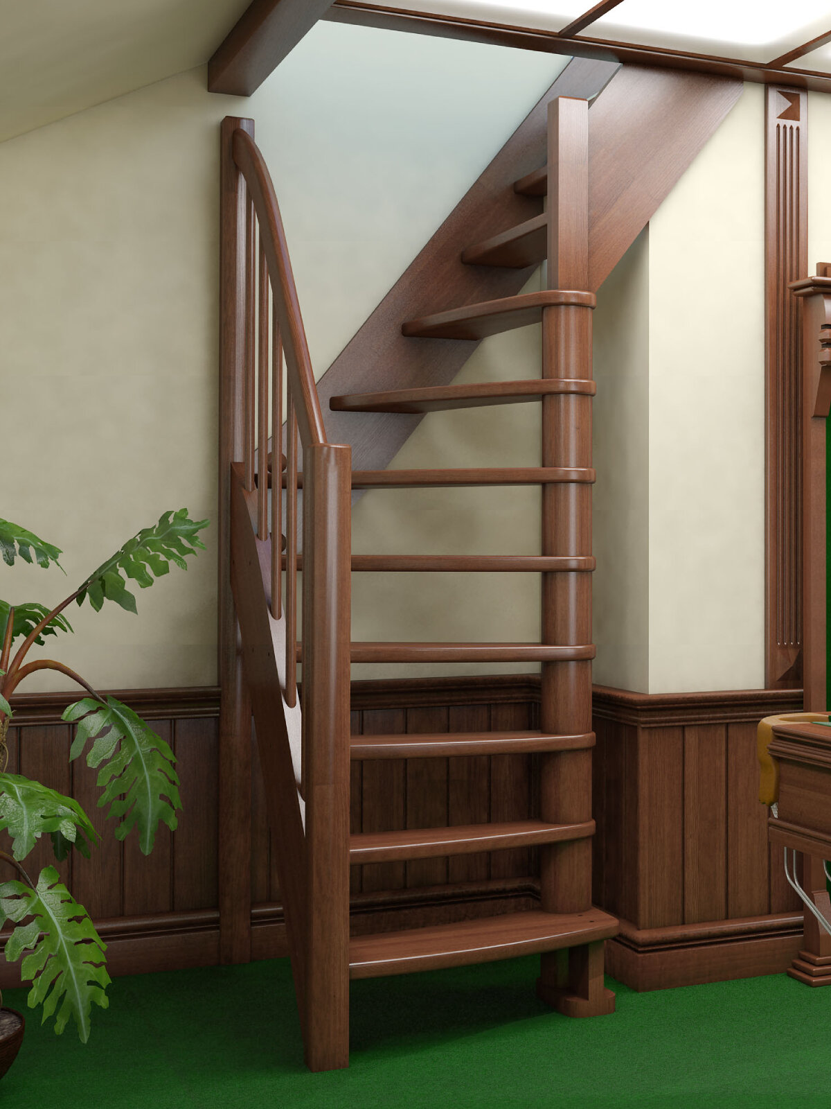 ХИТ ПРОДАЖ! Конструкция лестницы отличается от предыдущей модели изящными изогнутыми тетивами и поручнем, закругленными забежными (поворотными) ступенями. Усовершенствованная модель является малогабаритной и будет незаменима в небольших помещениях и дачных домиках. Компактная конструкция позволяет произвести монтаж в помещениях с небольшим проемом второго этажа. Удобная и надежная, эта лестница станет визитной карточкой вашего дома.